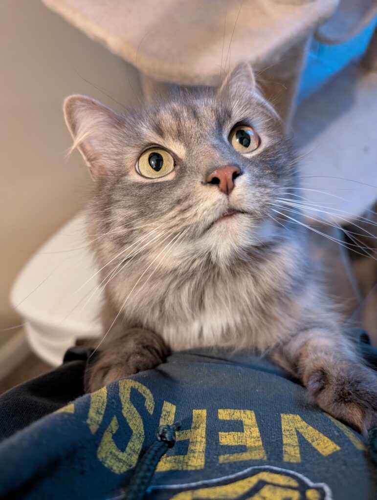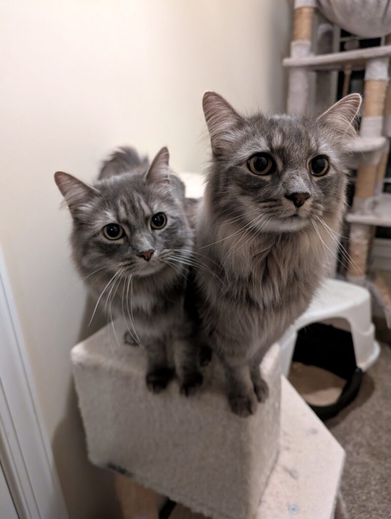 They have experience hanging out in a screened in porch and out on walks in harnesses, which are both great enrichment activities for cats. They are both pretty laid back and enjoy meeting new people. They are always up for attention and affection, giving head bonks and seeking to be pet. Once they are really used to their people, they are incredibly affectionate. (Blade loves sniffing my face and ears while I scoop their litter box and I’ve even gotten little kisses a few times!)