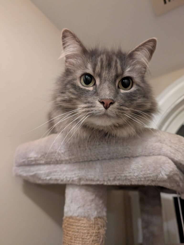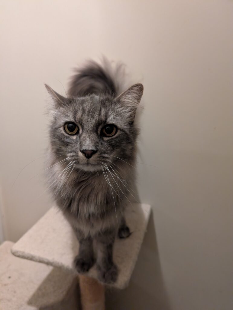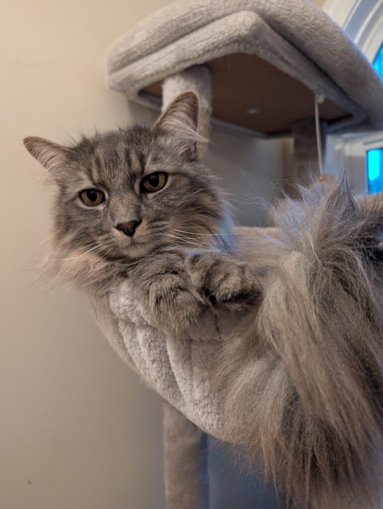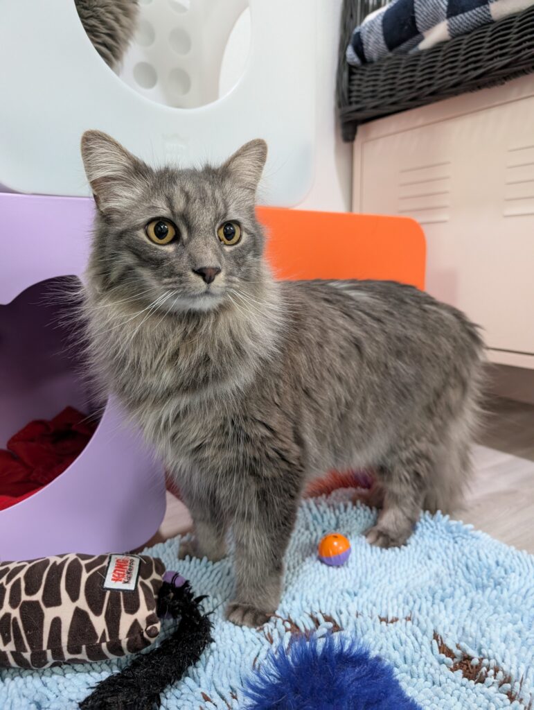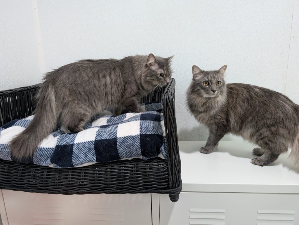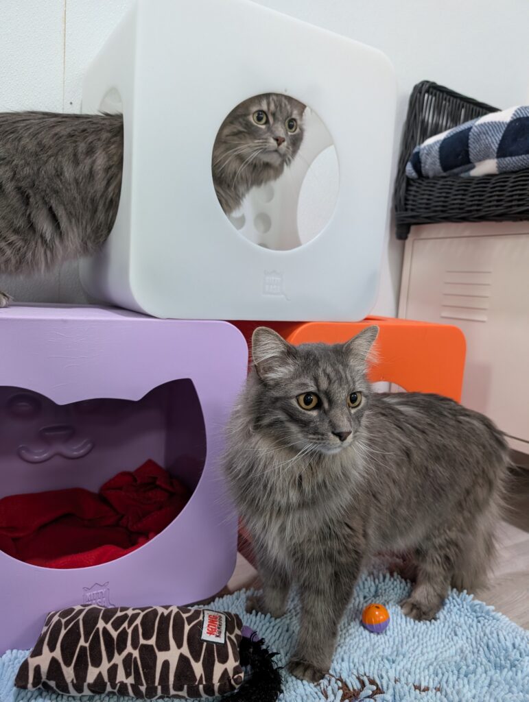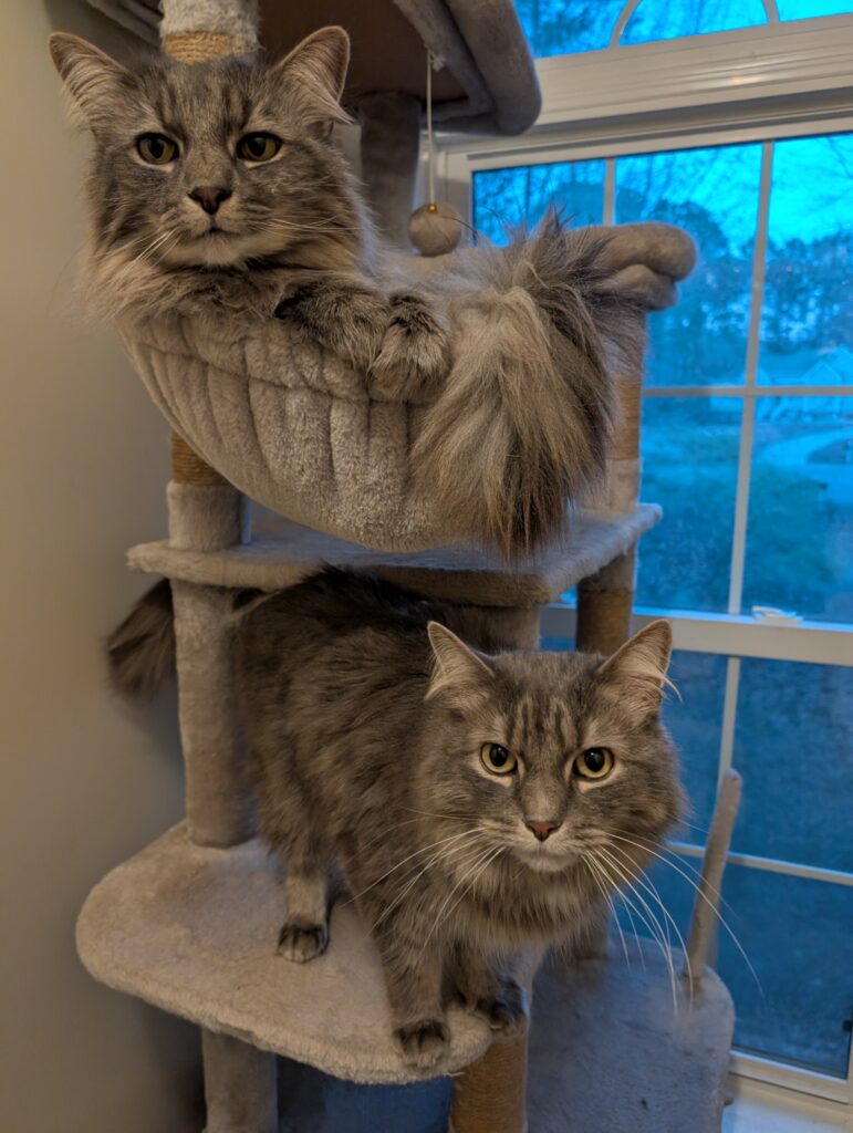 New situations can be a little challenging but they settle in pretty quickly. Food is one of their favorite things and they love all kinds of treats, from crunchy ones to churus. They scarf them up so fast, they barely even notice when a pill is added! Food and treat times are one of the times you’ll hear their voices and it’s adorable! Both boys will give you the littlest, most gentle and unobtrusive meows that don’t sound like they should match those big fluffy bodies. Catnip is also a favorite and they both love to roll around in it. If it’s on or in a toy, they will pull it up to their face and intensely rub all over it, it’s so cute!