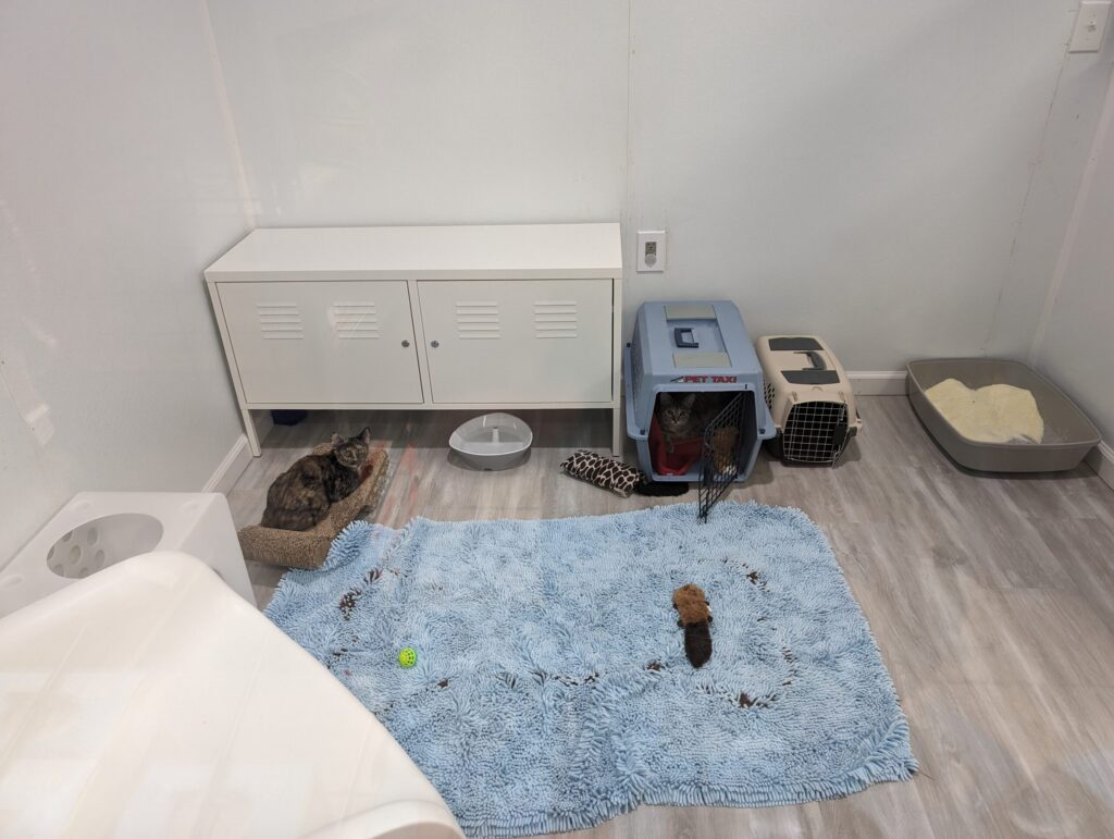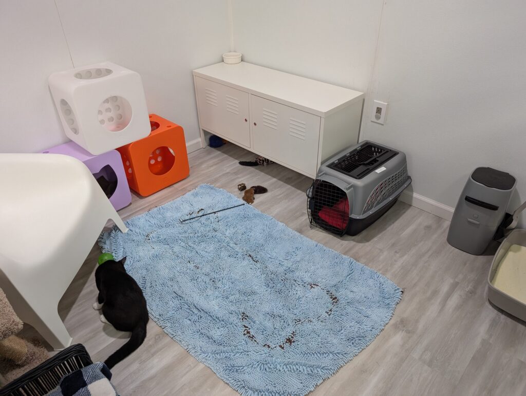 You’ll want enough space for a litter box, a soft place to sleep, something appropriate to scratch on, and food and water bowls. Make sure that the food and water bowls are away from the litter box as much as possible when you are setting up! Its also a good idea to keep the food and water bowls somewhat separated if you have the space. Cats often prefer not to drink right by their food because in the wild, that means that the water supply was likely contaminated by their kill.