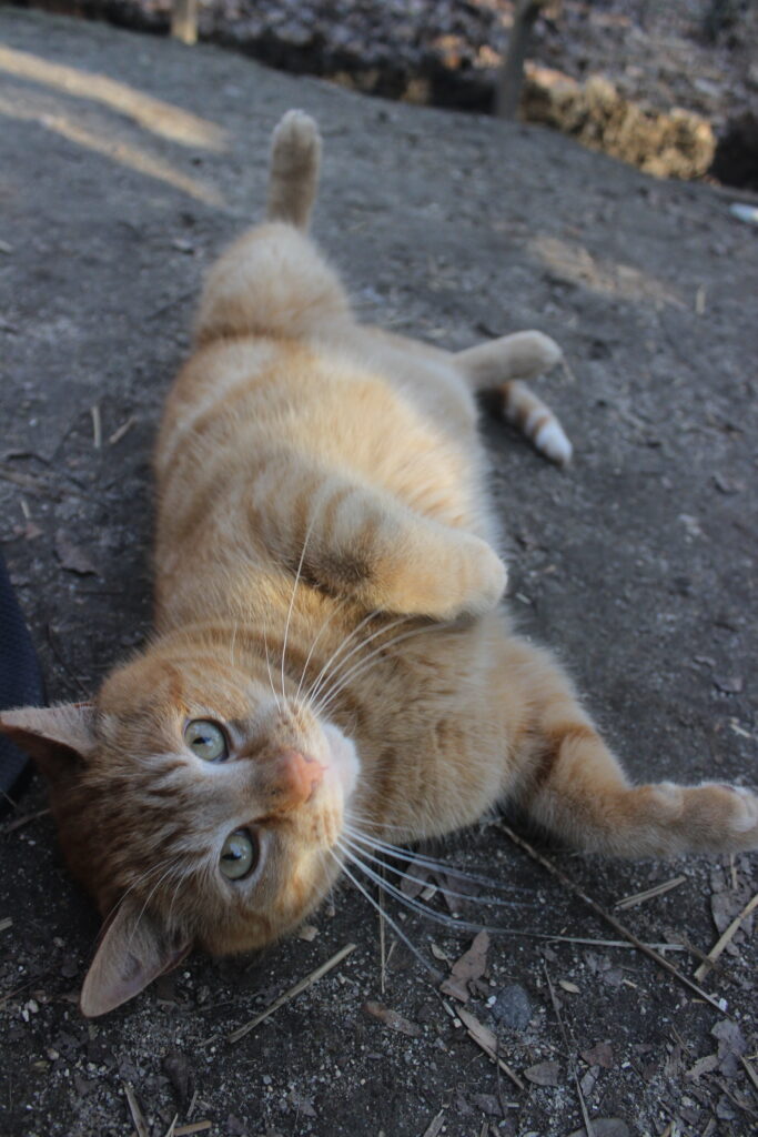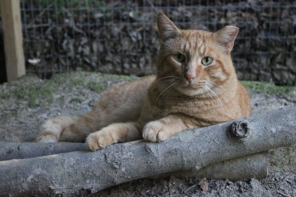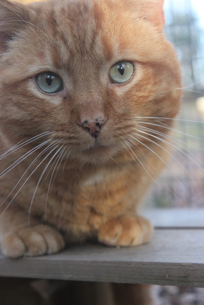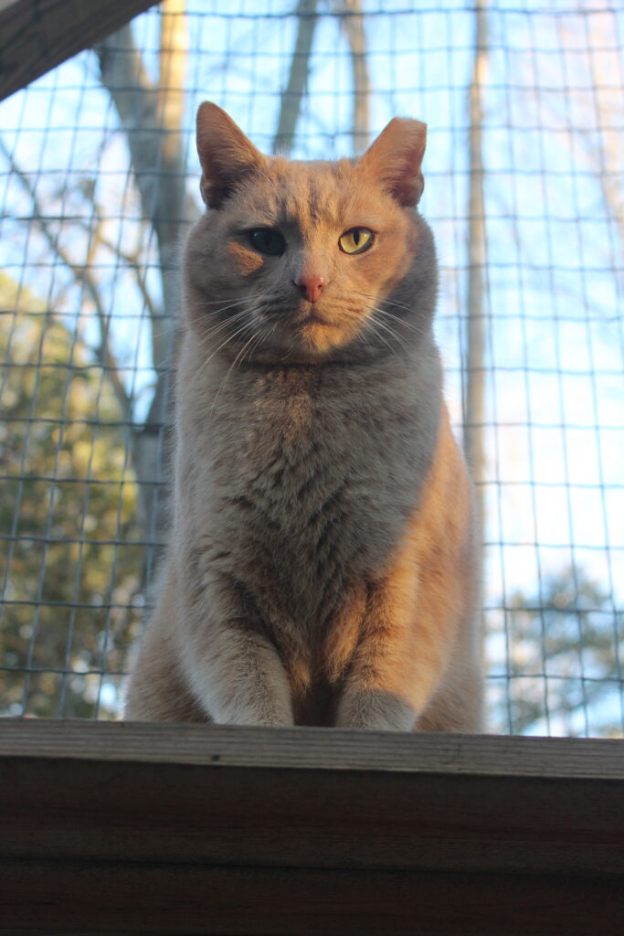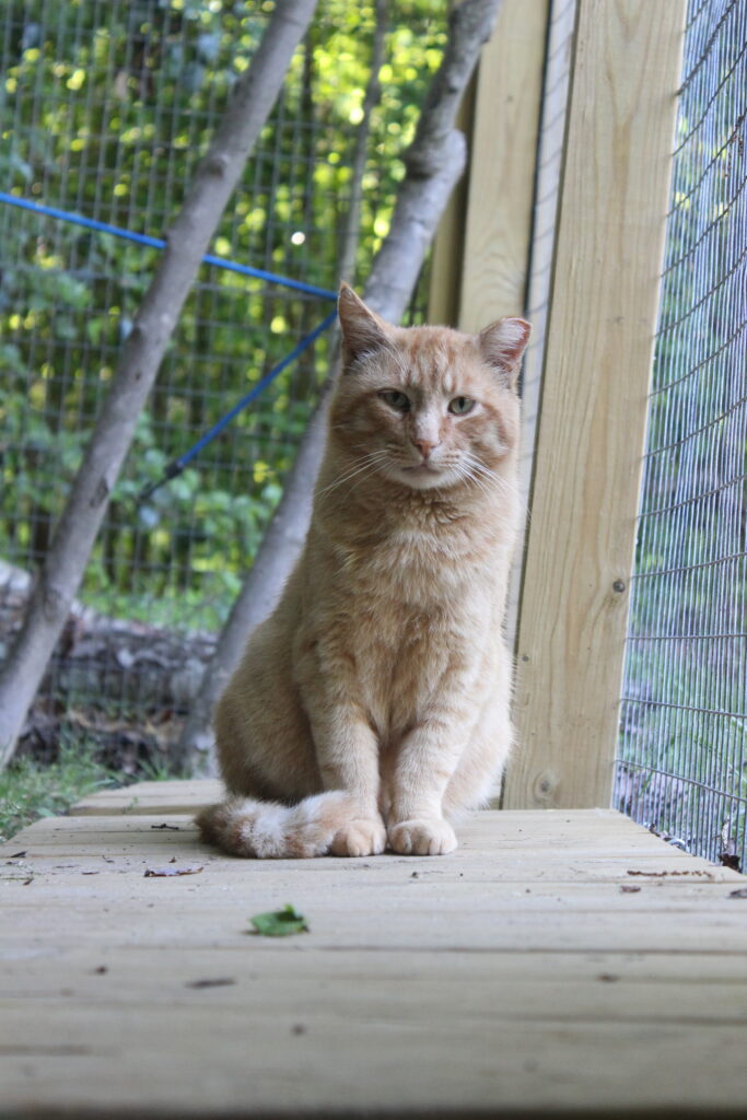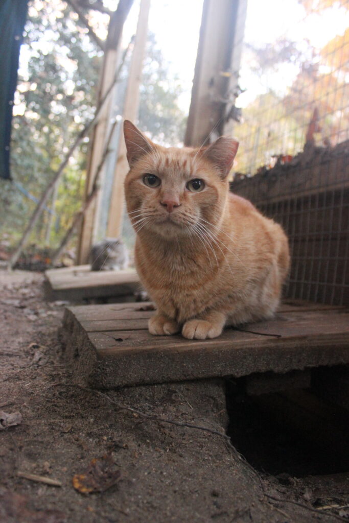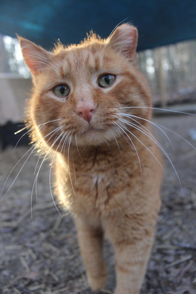 Boq was our big orange boy. At the time of his neuter surgery he was a hearty 14 pounds! He may well have been a sibling to Fiyero, but it also may be that their strikingly similar looks are coincidence. Boq is the first cat we saw Fiyero chasing but he never was completely run off. He loved his food and would shove basically everyone out of the way to get to his bowl first. He was very much a gentleman of leisure and didn’t exert himself unless it was meal time. He was not one to partake in playing much and generally avoided much interaction with the others. He watched everything from a distance, probably because of Fiyero’s history of chasing him away from the feeding area for so long while they lived at the apartment complex. When it got cold, Boq was certainly willing to cuddle into a shelter with at least one other companion for warmth. He unfortunately got out of the enclosure during a stressful encounter with a stray dog and has never been seen again, in spite of setting up cameras and traps in the surrounding woods for a long time after the incident.