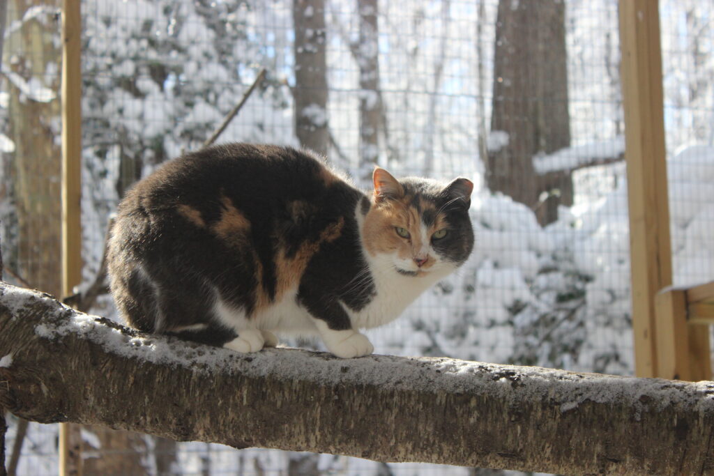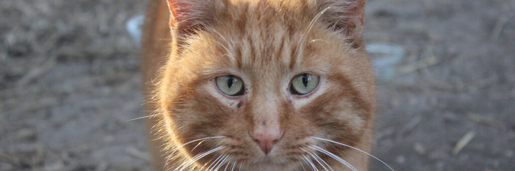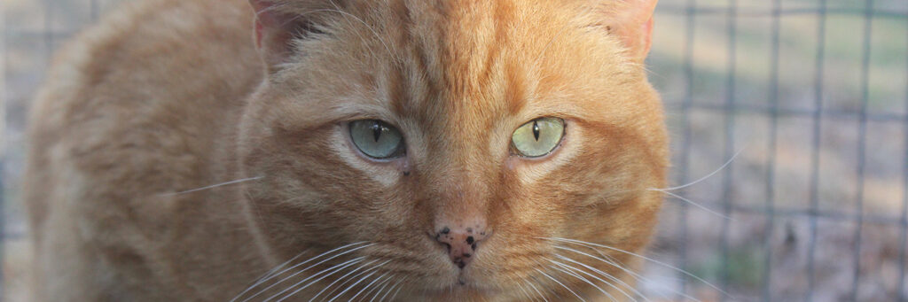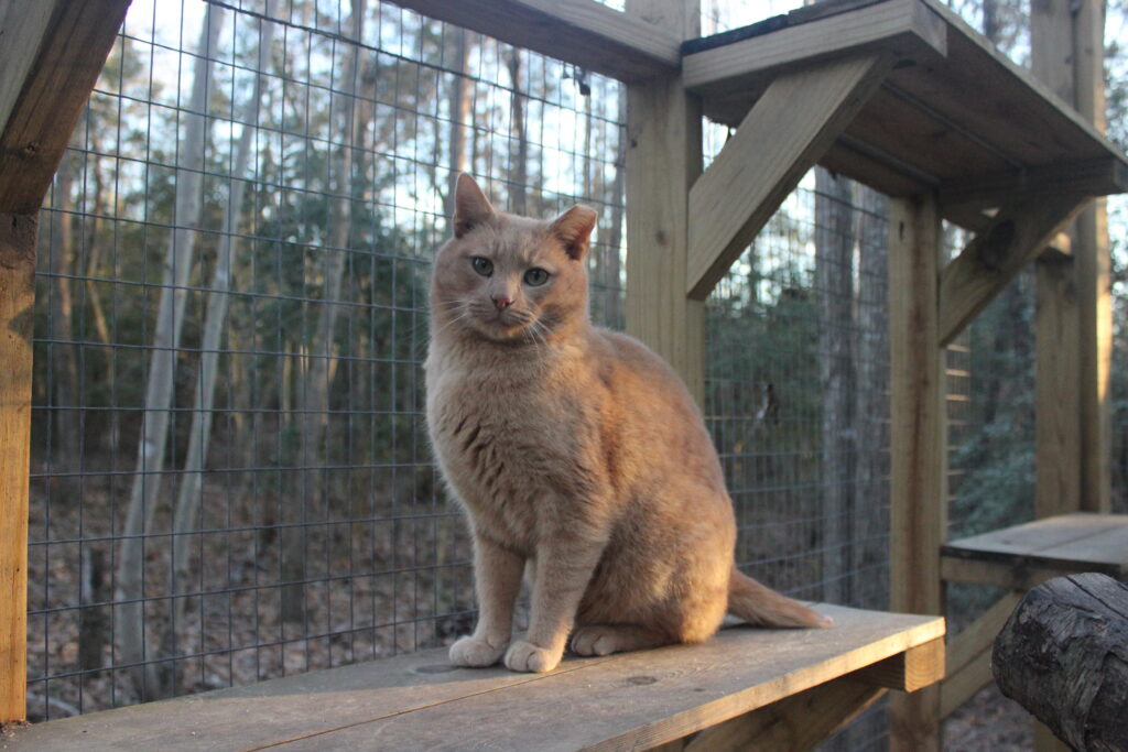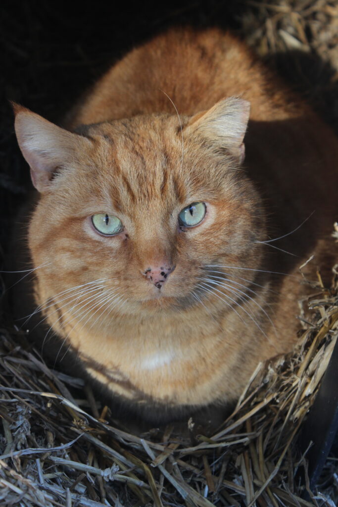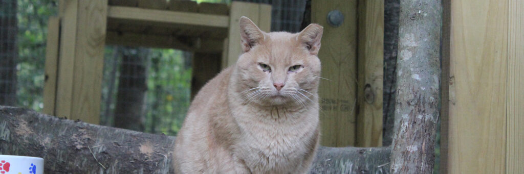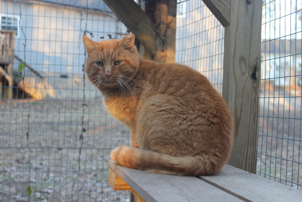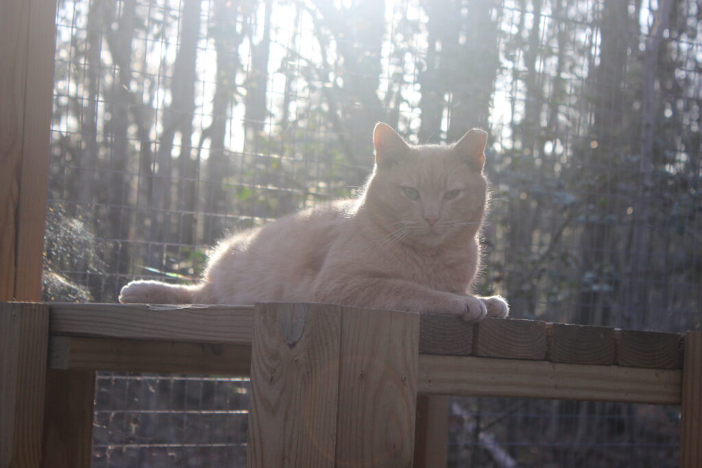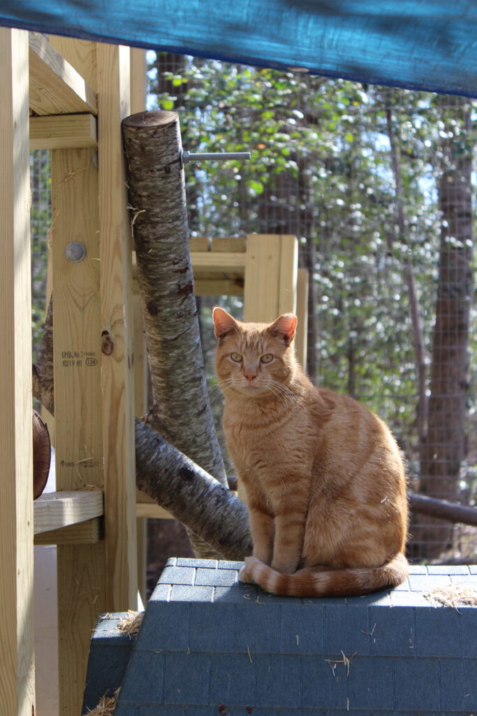 Boq was our big orange boy. At the time of his neuter surgery he was a hearty 14 pounds! He may well have been a sibling to Fiyero, but it also may be that their strikingly similar looks are coincidence. Boq is the first cat we saw Fiyero chasing but he never was completely run off. He loved his food and would shove basically everyone out of the way to get to his bowl first. He was very much a gentleman of leisure and didn’t exert himself unless it was meal time. He was not one to partake in playing much and generally avoided much interaction with the others. He watched everything from a distance, probably because of Fiyero’s history of chasing him away from the feeding area for so long while they lived at the apartment complex. When it got cold, Boq was certainly willing to cuddle into a shelter with at least one other companion for warmth. He unfortunately got out of the enclosure during a stressful encounter with a stray dog and has never been seen again, in spite of setting up cameras and traps in the surrounding woods for a long time after the incident.