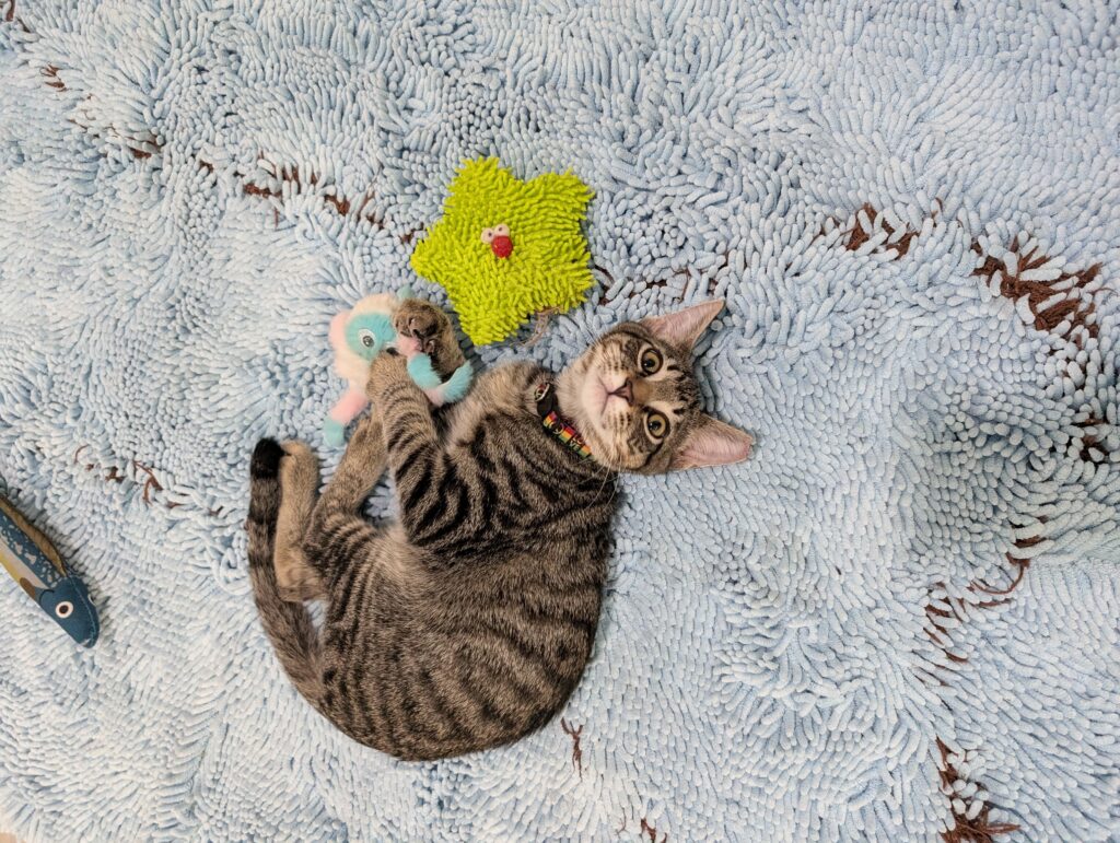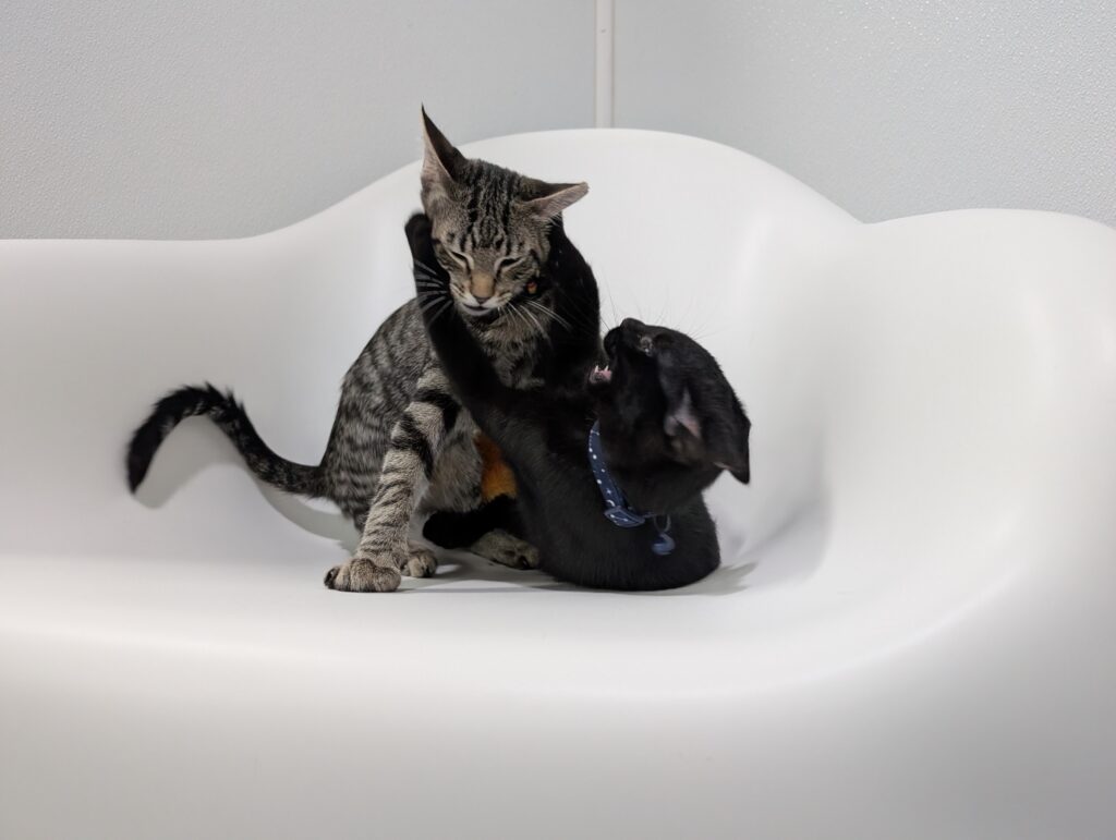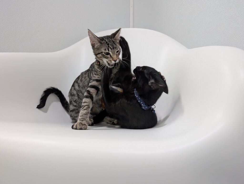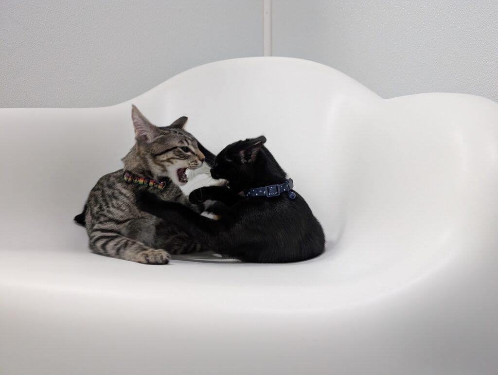 Ralph and Felix are typical kittens, full of energy and so, so affectionate. These guys haven’t met a toy they don’t love. Small and good for flinging? Excellent, let’s chase. Big, plush, and good for kicking and biting? Wrestle Mania time. Jingle-y bell or crinkle-y paper? Find your earplugs.