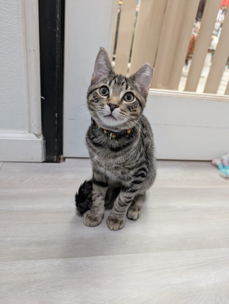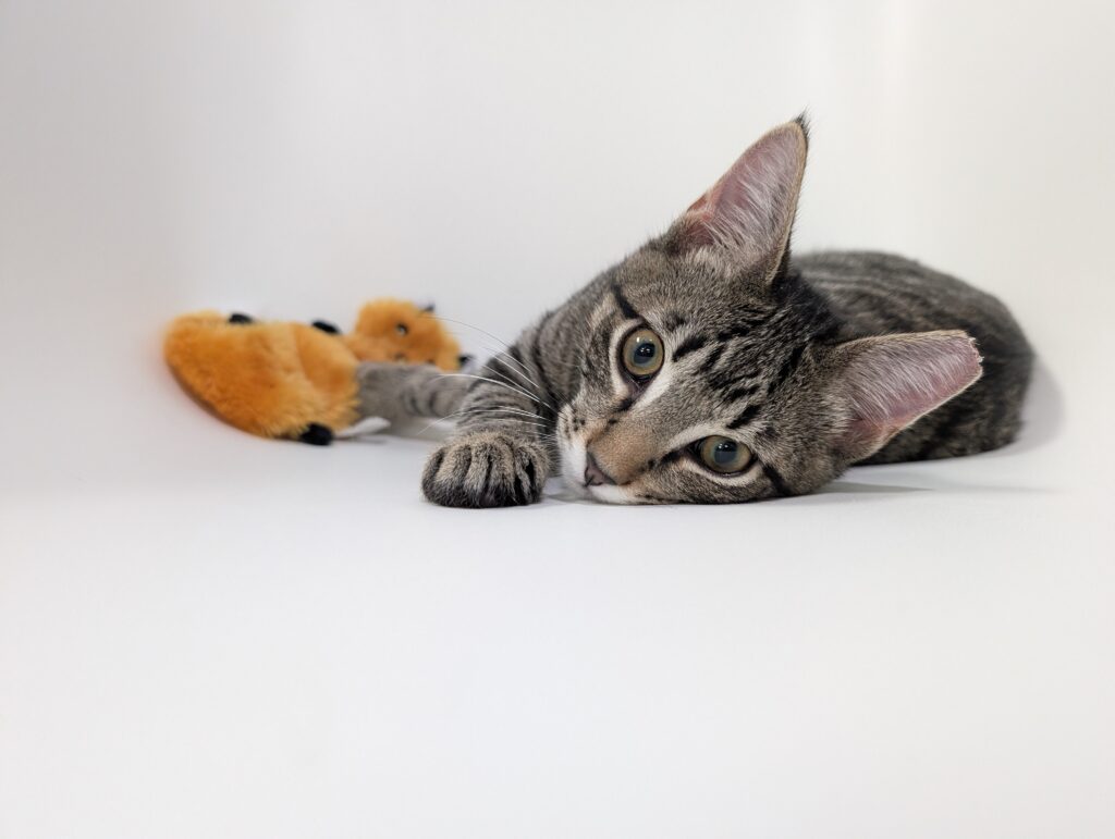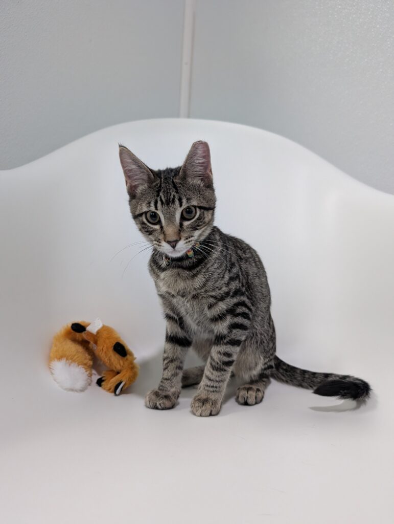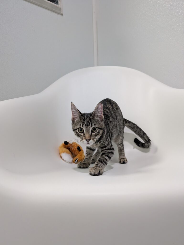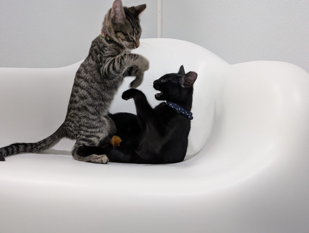 Ralph and Felix are typical kittens, full of energy and so, so affectionate. These guys haven’t met a toy they don’t love. Small and good for flinging? Excellent, let’s chase. Big, plush, and good for kicking and biting? Wrestle Mania time. Jingle-y bell or crinkle-y paper? Find your earplugs.