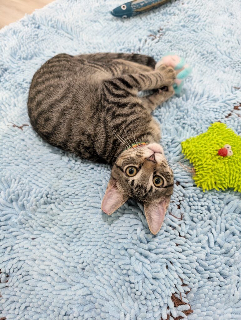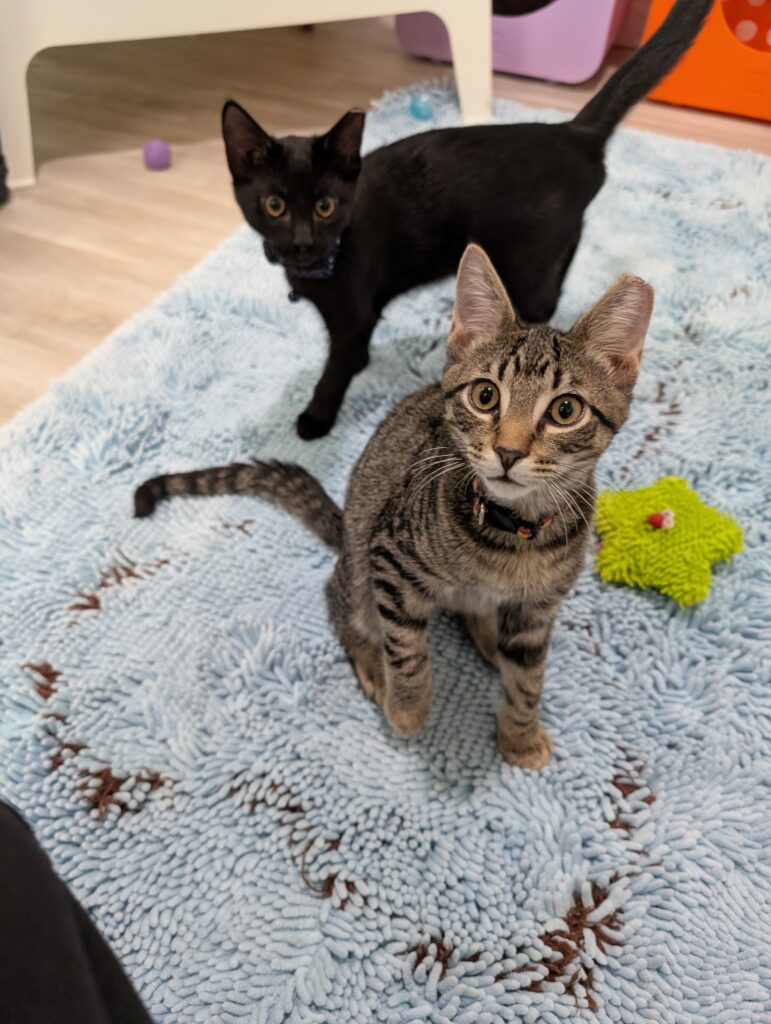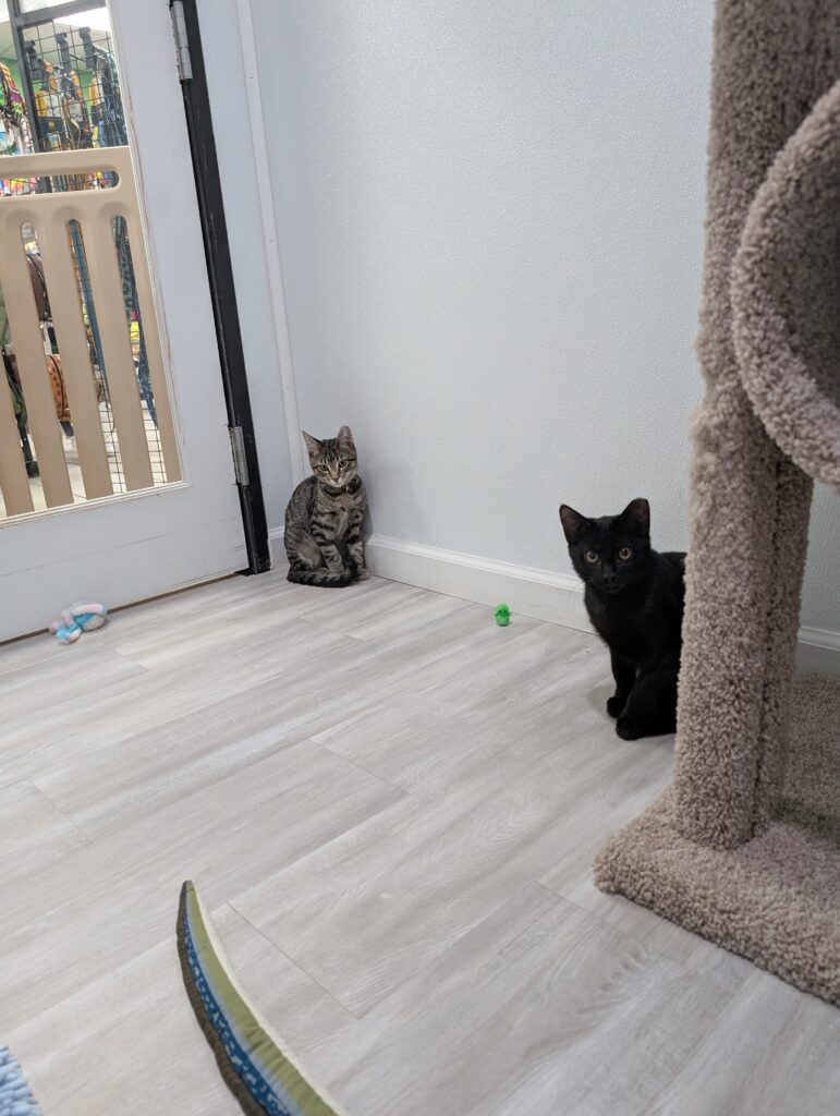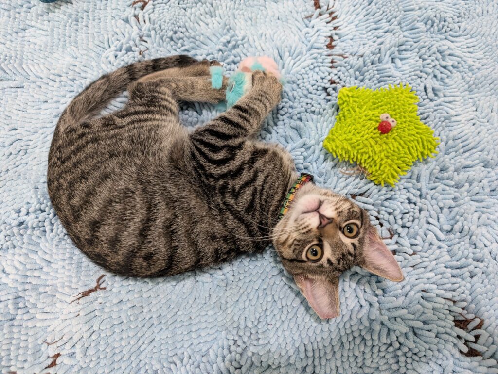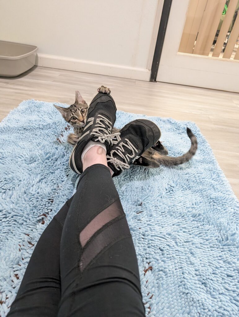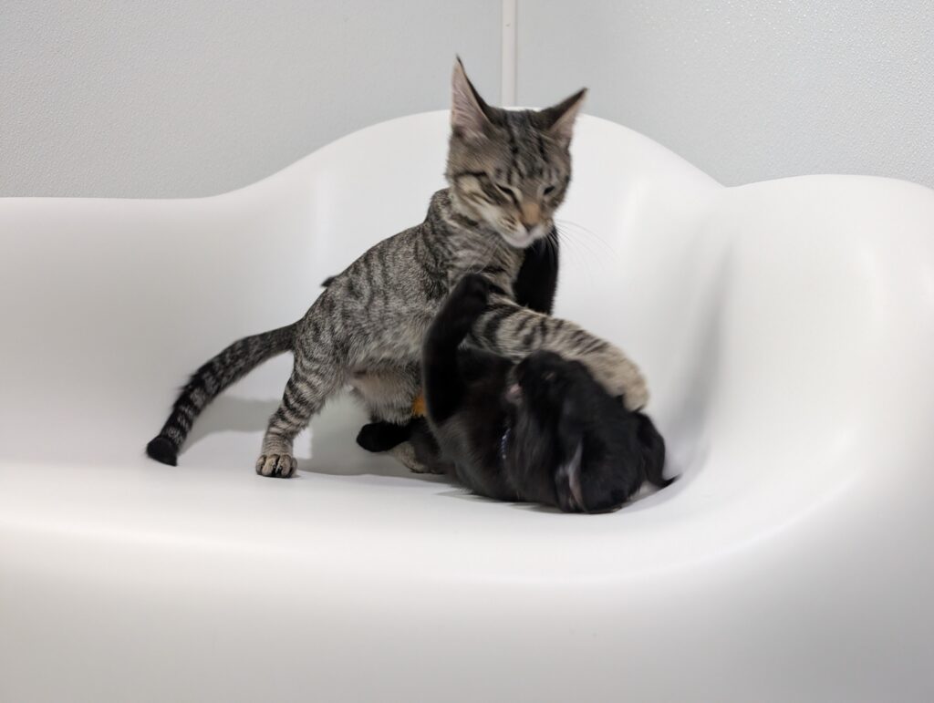 If you sit down, one or both are ready to take over your lap. It may not last long, after all, there is a TON of playing to do when you’re a kitten, but they are purr machines while they’re there.